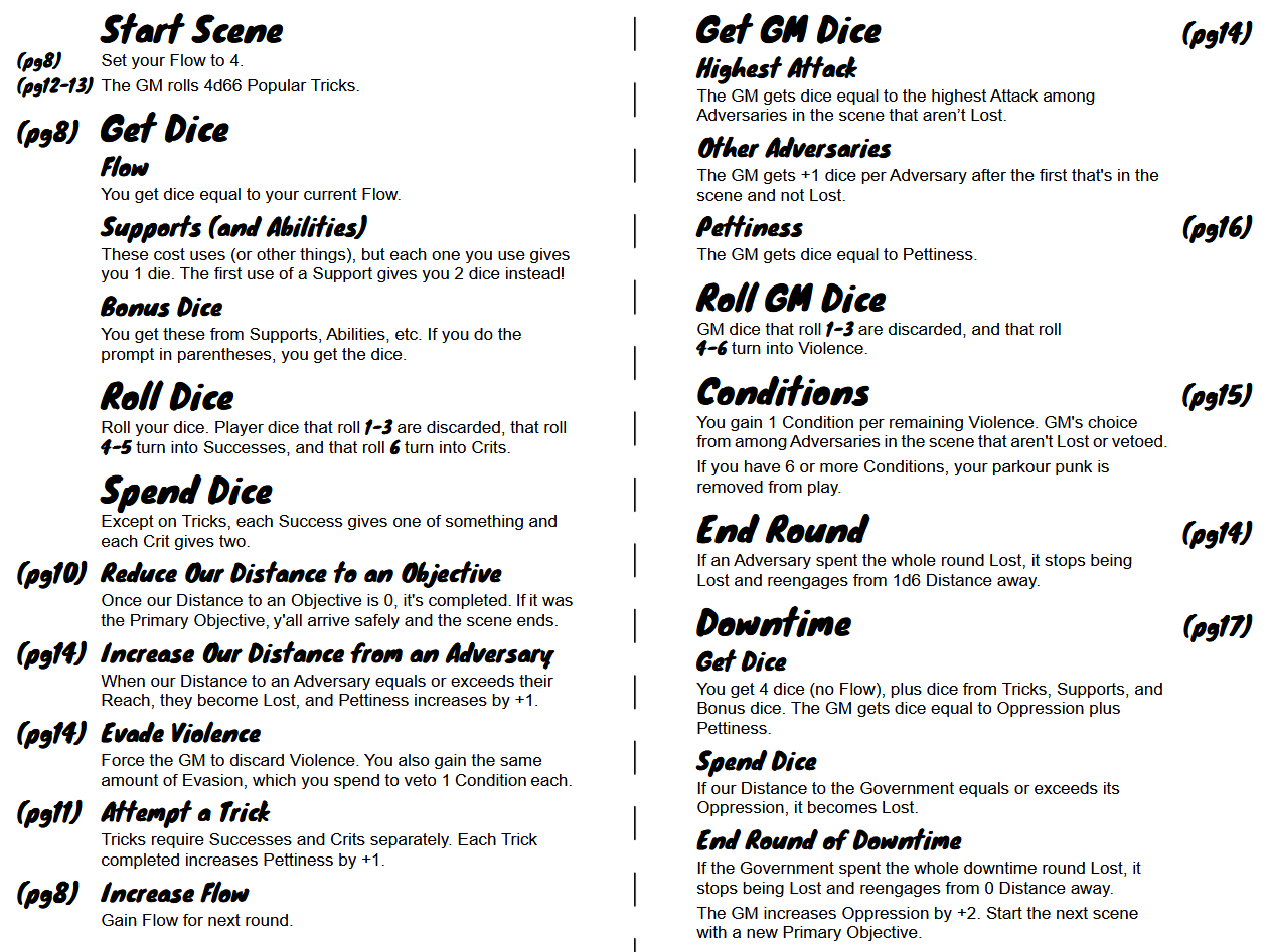 But you won't spend all your time doing parkour, you'll also help out around your community in downtime. Outpace the Government's growing Oppression: spend dice to do cool Tricks that get people's attention, turn that attention into more dice in downtime to spend on mutual aid projects, and earn new Supports for more dice to spend on more Tricks!